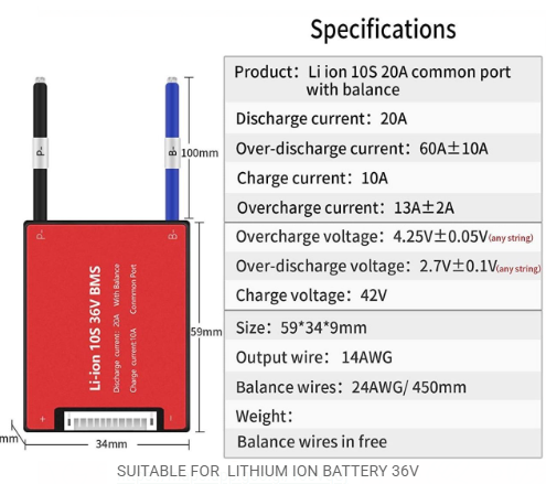High-quality 10S 36V 20A BMS designed for lithium-ion battery packs. Provides safe charging, stable discharge, and strong protection for e-bikes, scooters, and medium-capacity power packs.